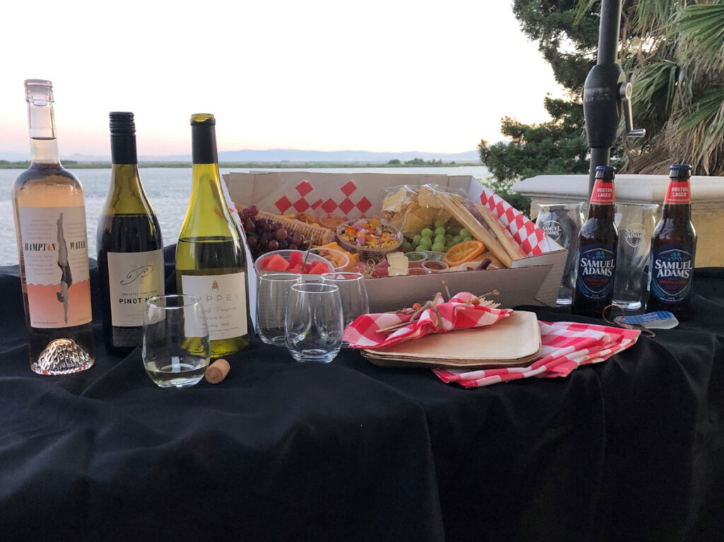 Two ticket prices are available; $200 for four people and $100 for two people. The $200 tasting for four people includes: bottles of “Summer” Wines, including Pressley wines, Pinot Noir, Lodi Vinterners: Rippey Family Vineyard Chenin Blanc, Hampton Water Rosé. Plus two bottles of Premium Samuel Adams Beer, two Hemly Hard Ciders plus a charcuterie box for four, place setting for four (bamboo plates, bamboo knives and forks, red check cloth napkins) plus four 9oz. wine glasses and two beer glasses.
