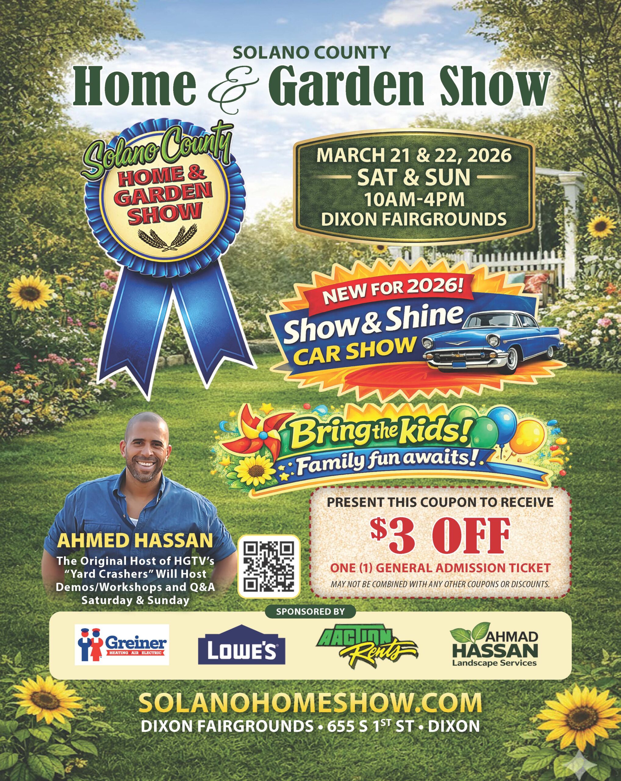 •$3 off Coupon for general admission available online at www.solanohomeshow.com. Plus vendor and car show applications available.
